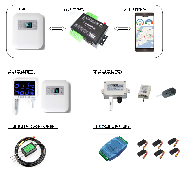 可以提供现场带显示屏幕的温湿度传感器,不带显示的温湿度传感器,和防水温湿度,还可以提供土壤温度水分监控报警,提供多个监测点的温湿度检测报警。